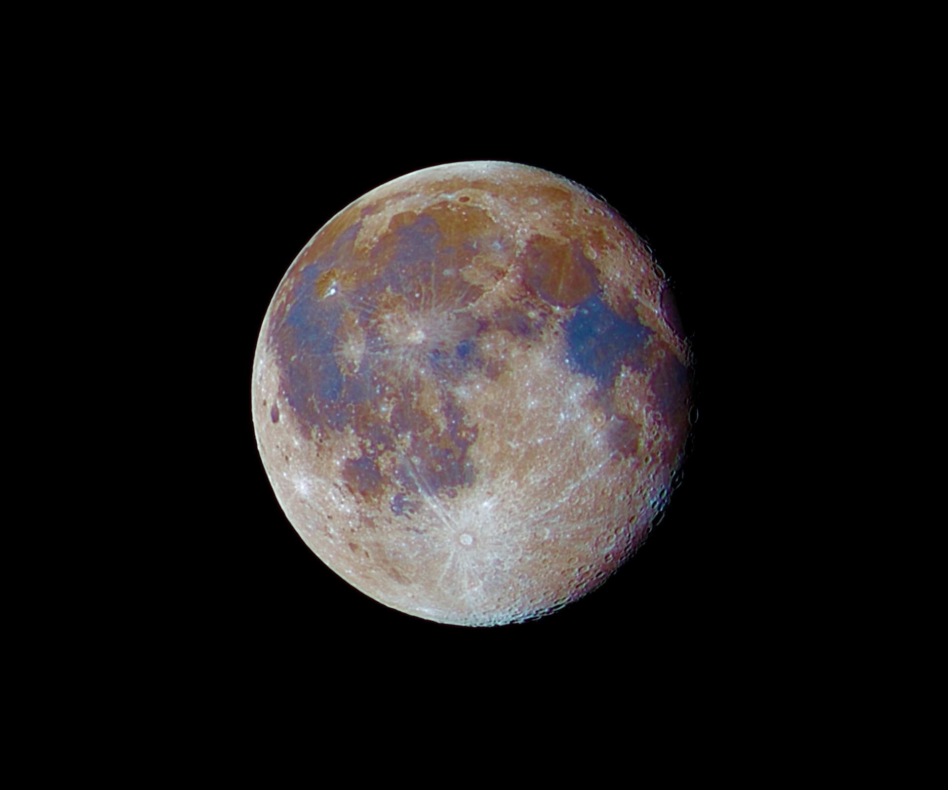 Foto della luna effettuata con un piccolo obiettivo e saturata per evidenziare i colori naturali della superficie lunare dovuti ai diversi materiali minerali. Foto di Davide Quattrociocchi