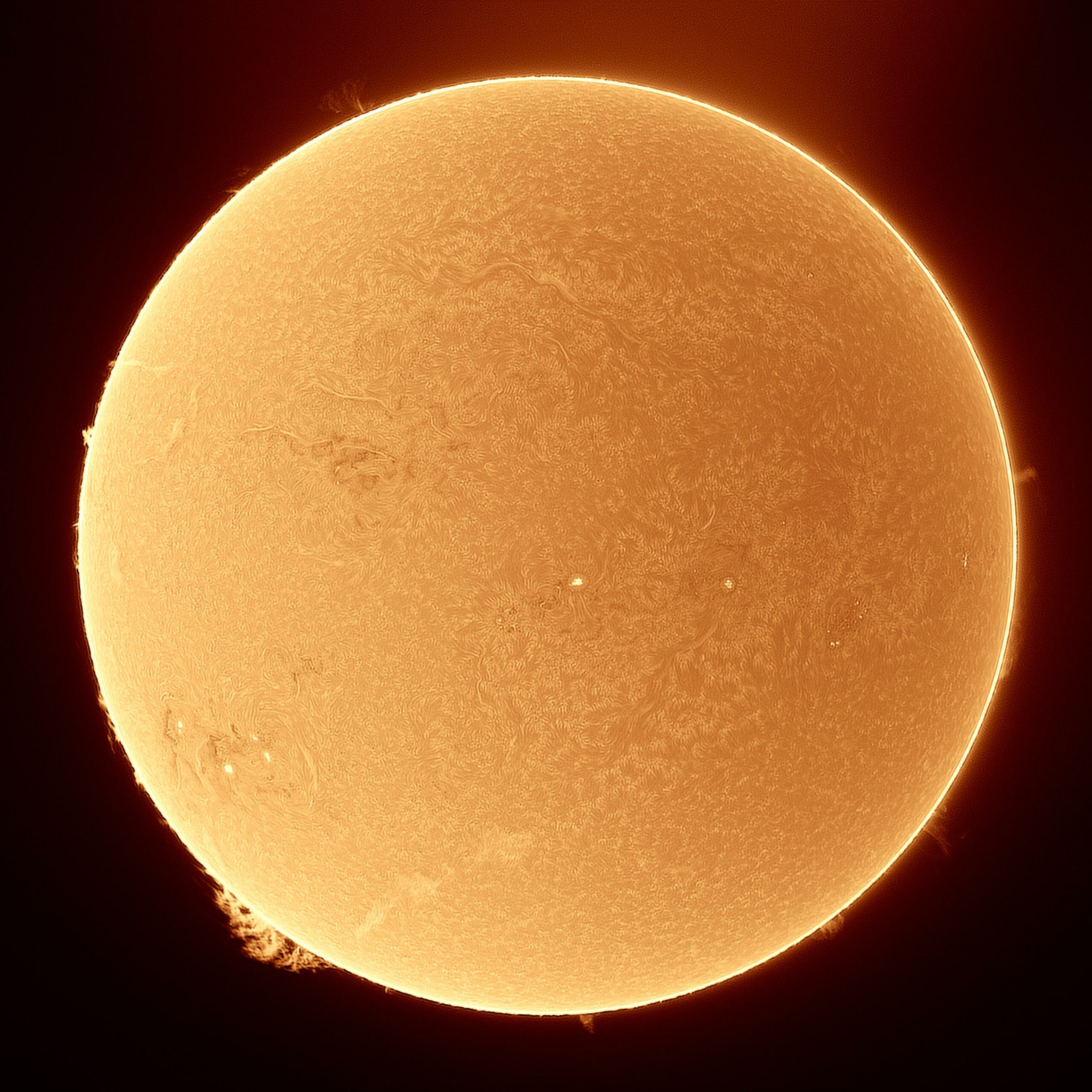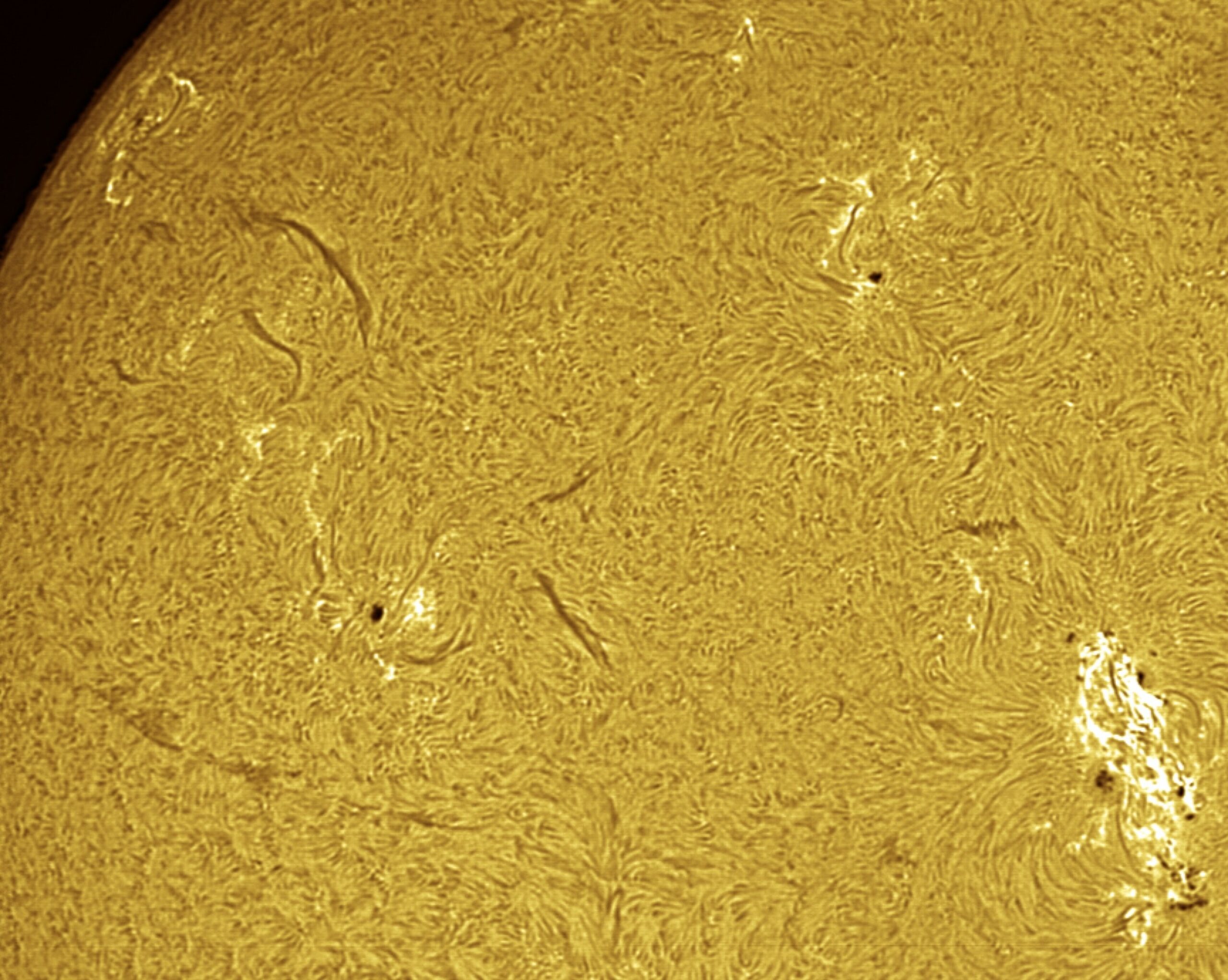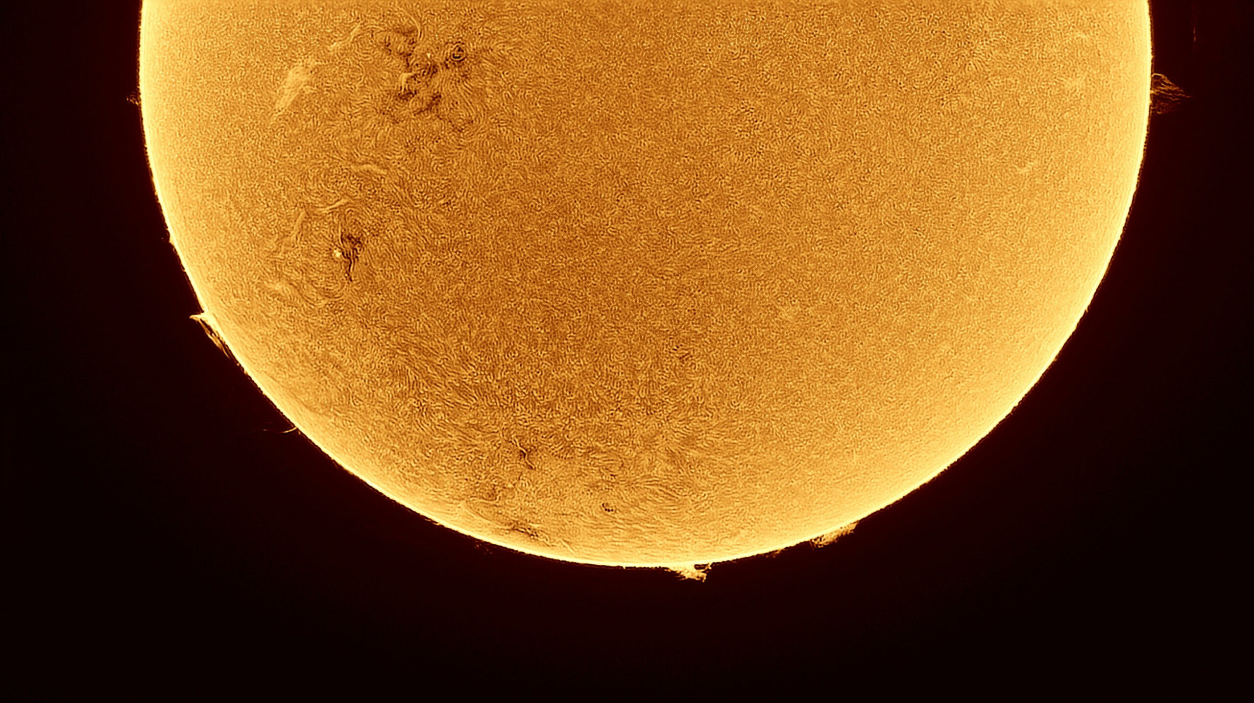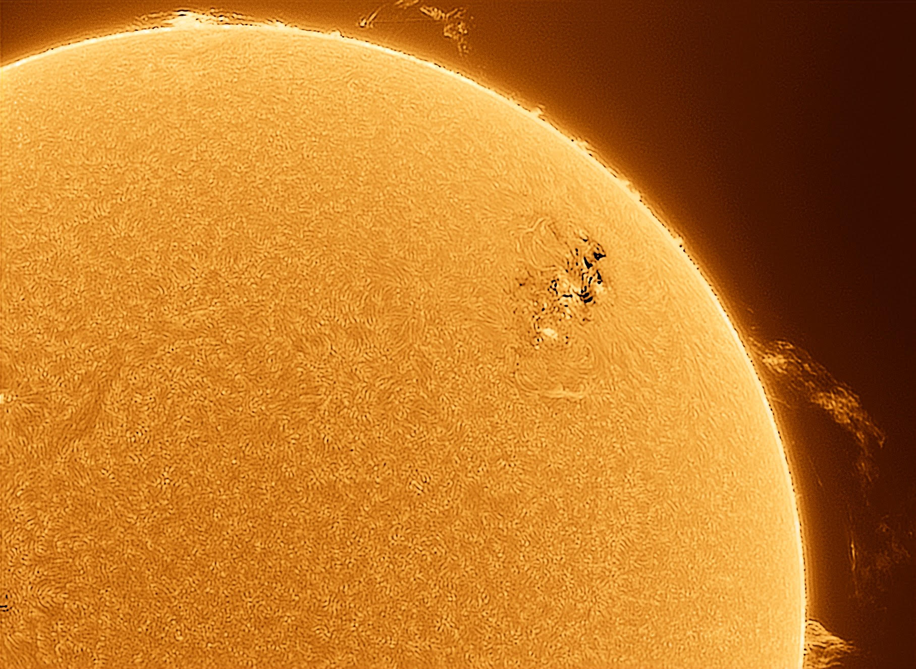 Dettagli della superficie solare . In evidenza una grande macchia solare e le protuberanze. Foto di Matteo Scienza.