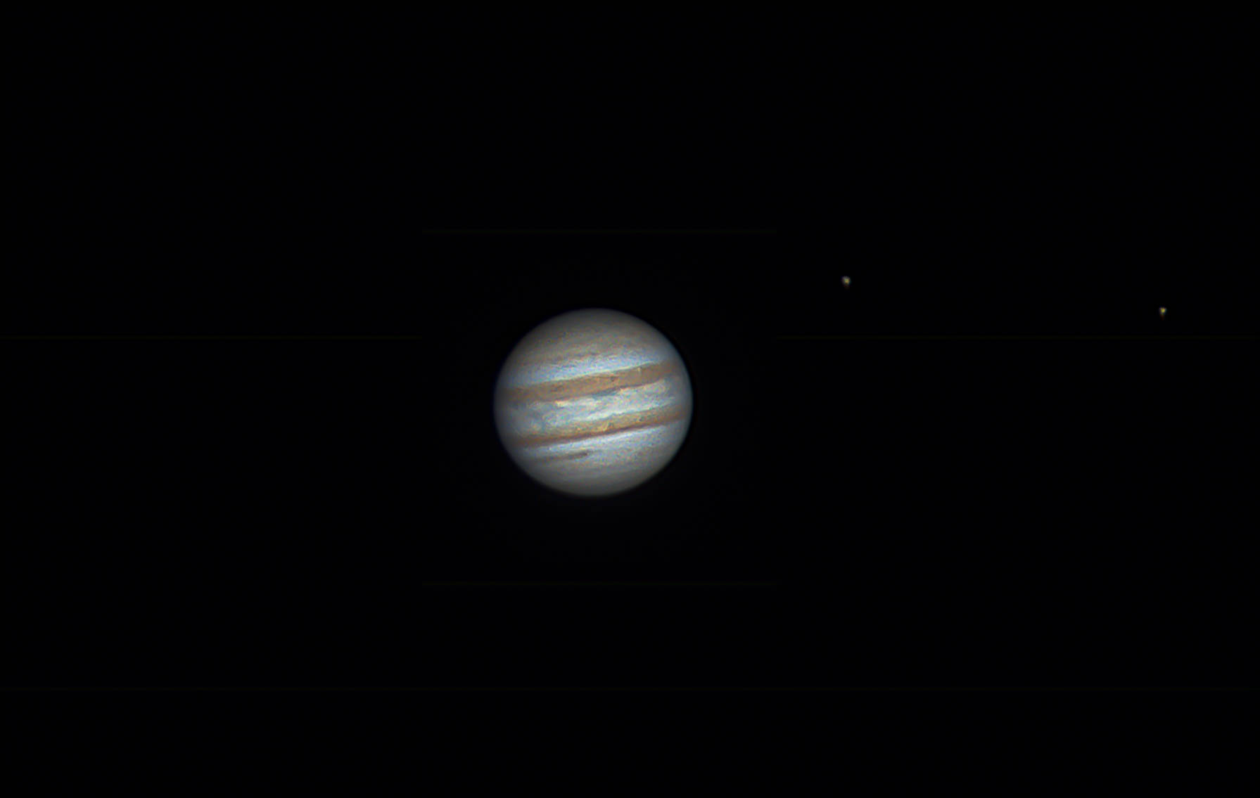 Una bella immagine di Giove con due dei suoi satelliti ben visibili sulla sinistra. Foto di Leonardo Bianchi